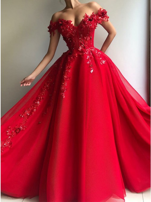 Glamour Off Shoulder Red Ball Gowns Prom Dress with Appliques