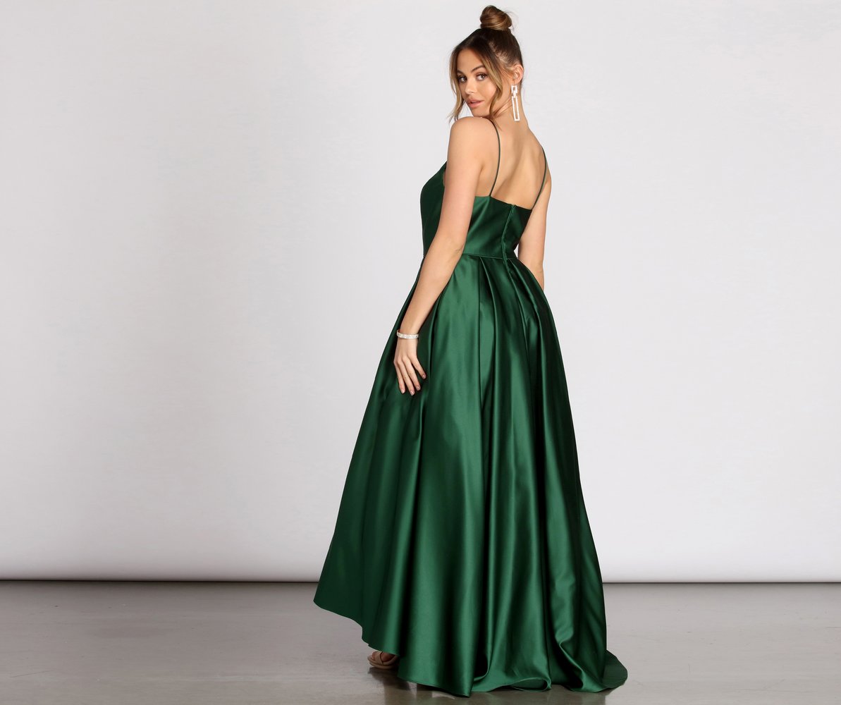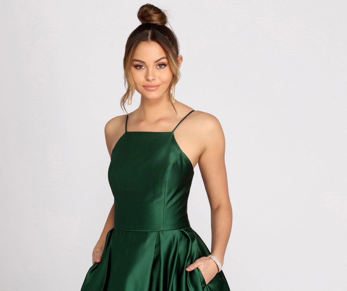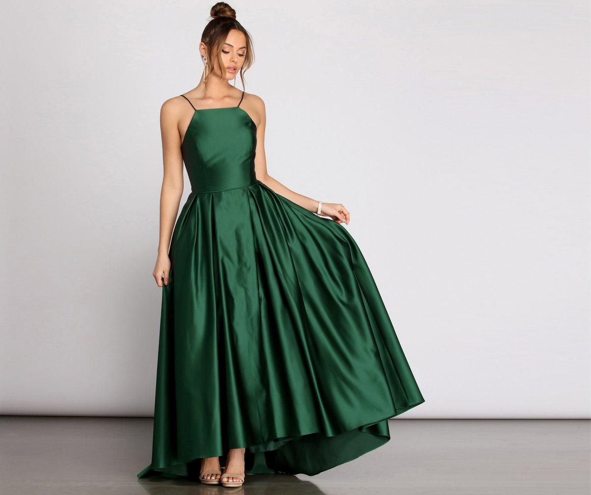 Make a captivating entrance that will make you feel like you're living out a dreamy evening! Our beige Harper dress features a sleeveless bodice, a square neckline with a racer bust, built in boning, padded cups and princess seams. Her slim fit bodice leads to a voluminous ball gown silhouette accented with hidden side pockets, pleating detailing and a petticoat. Dress is composed of a beige hued lined satin fabric that offers a relaxed fit with minimal stretch. Includes a hidden back zipper closure.