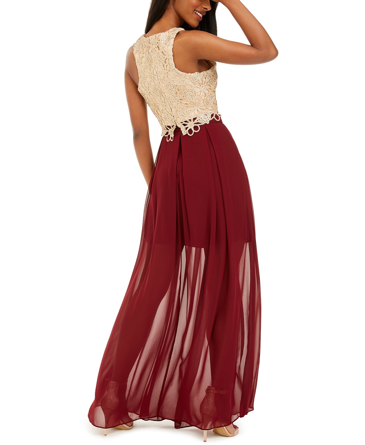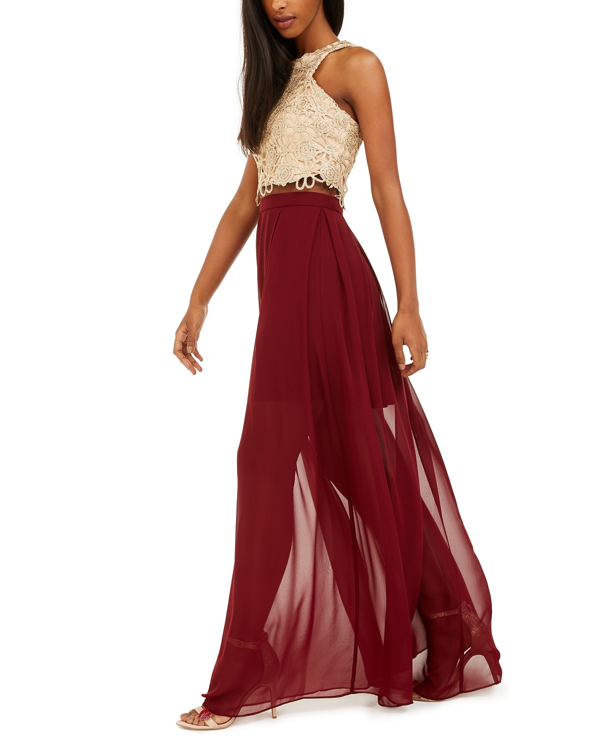 B Darlin tempts you to go the dramatic route with this exotic pairing, a cropped, crocheted top and a floaty chiffon skirt.
