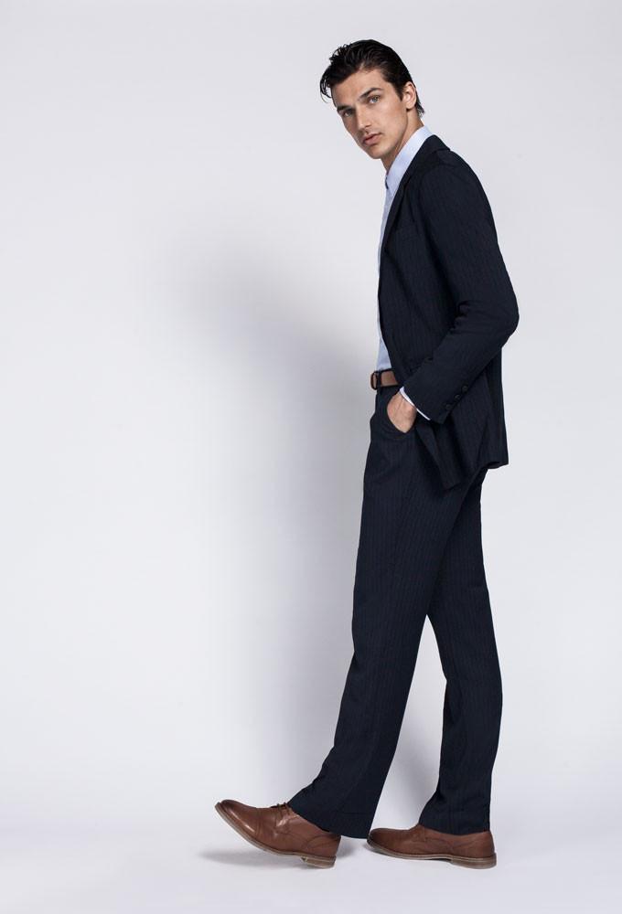 Classic, mid length, two button suit jacket. Elegantly lined with detailed stitching. Notch collar, welt pocket on left chest, two flap pockets and an inside chest pocket. Single slit at back center.