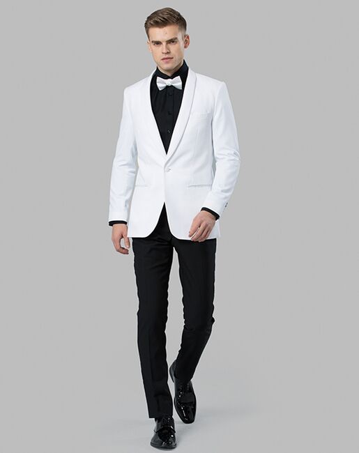 The Savannah. Mix southern charm with a splash of James Bond and you will find our white shawl lapel tuxedo is the result. The jacket is a poly/wool blend with satin trim and is available in modern fit only. The white and black tuxedo rental comes with black flat front pants to break up the look and add a touch of elegance.